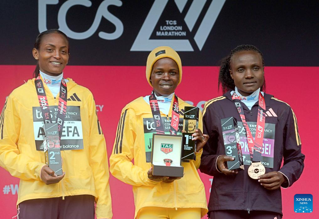 First placed Peres Jepchirchir (C) of Kenya, second placed Tigist Assefa (L) of Ethiopia and third placed Joyciline Jepkosgei of Kenya pose on the podium during the awarding ceremony for the women's elite race event at 2024 London Marathon in London, Britain, April 21, 2024. (Photo by Tim Ireland/Xinhua)