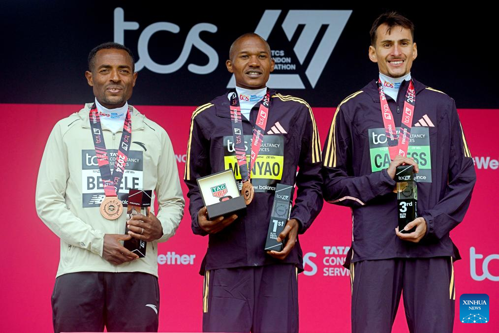 First placed Alexander Mutiso Munyao (C) of Kenya, second placed Kenenisa Bekele (R) of Ethiopia and third placed Emile Cairess of Britain pose after the men's elite race at 2024 London Marathon in London, Britain, April 21, 2024. (Photo by Tim Ireland/Xinhua)