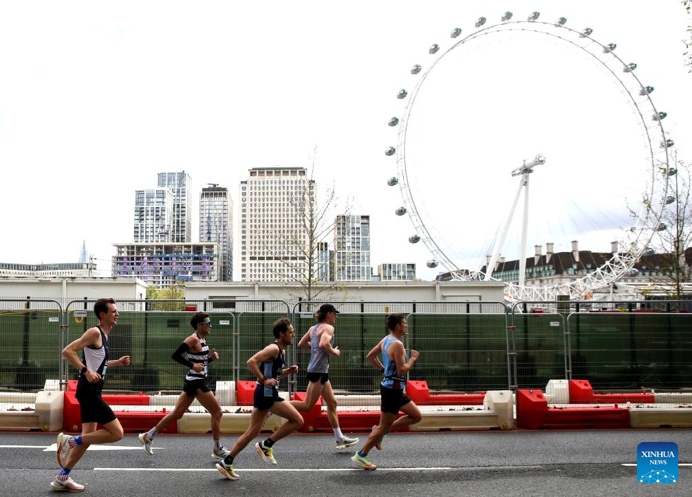 Participants run past the London Eye at 2024 London Marathon in London, Britain, April 21, 2024. (Xinhua)