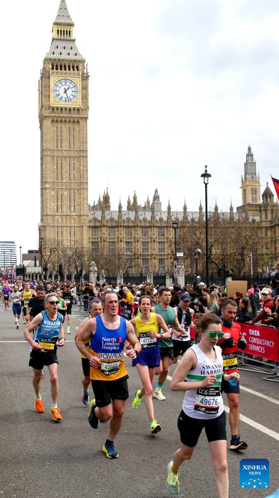 Participants run past Big Ben at 2024 London Marathon in London, Britain, April 21, 2024. (Xinhua)