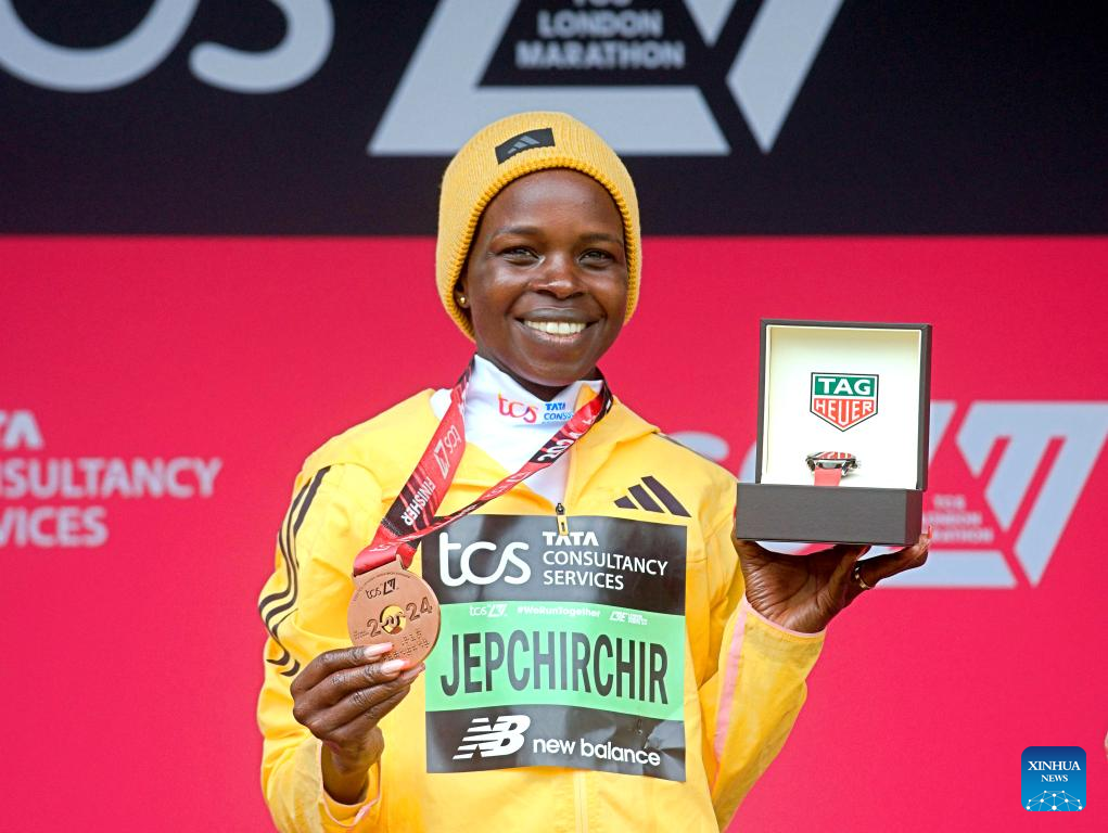 Women's elite race winner Peres Jepchirchir of Kenya poses on the podium during the awarding ceremony for 2024 London Marathon in London, Britain, April 21, 2024. (Photo by Tim Ireland/Xinhua)