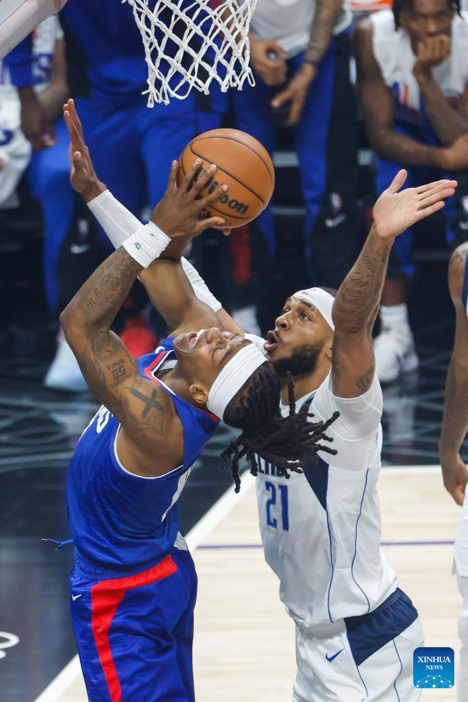 Los Angeles Clippers' Terance Mann (L) shoots against Dallas Mavericks' Daniel Gafford during the NBA first-round playoff match between Los Angeles Clippers and Dallas Mavericks in Los Angeles, the United States, April 21, 2024. (Photo by Ringo Chiu/Xinhua)