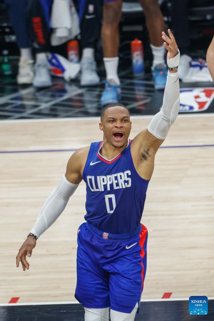 Los Angeles Clippers' Russell Westbrook celebrates after scoring during the NBA first-round playoff match between Los Angeles Clippers and Dallas Mavericks in Los Angeles, the United States, April 21, 2024. (Photo by Ringo Chiu/Xinhua)