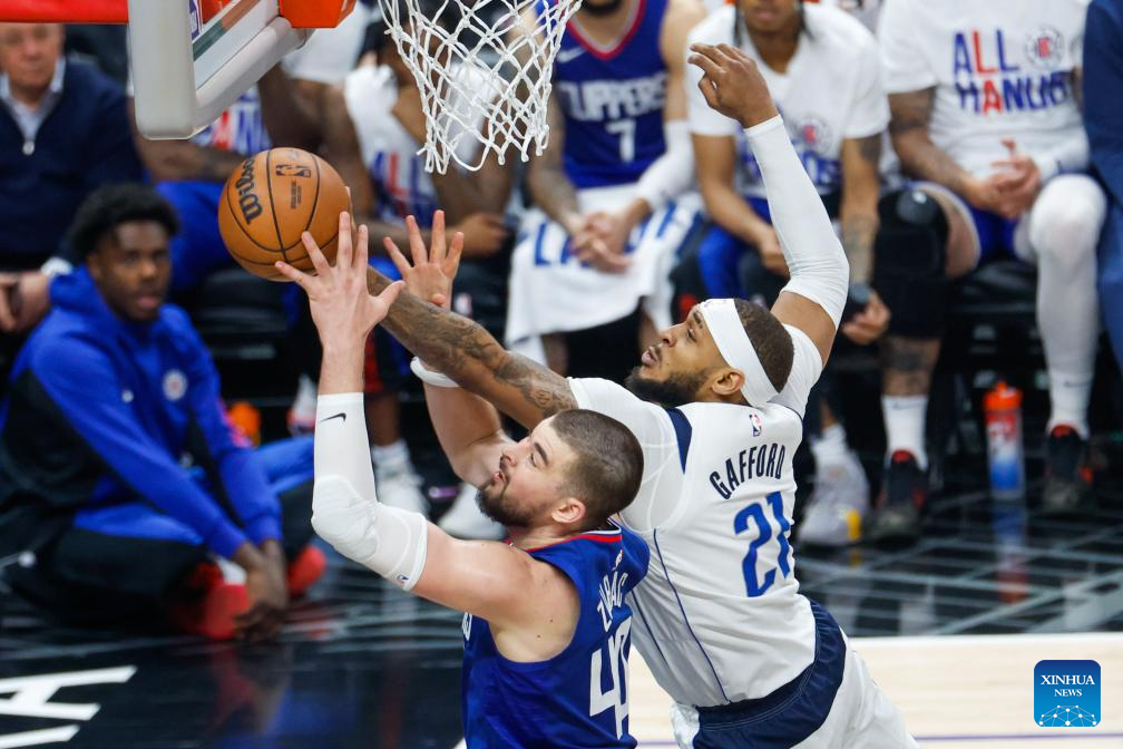 Los Angeles Clippers' Ivica Zubac (R) shoots against Dallas Mavericks' Daniel Gafford during the NBA first-round playoff match between Los Angeles Clippers and Dallas Mavericks in Los Angeles, the United States, April 21, 2024. (Photo by Ringo Chiu/Xinhua)