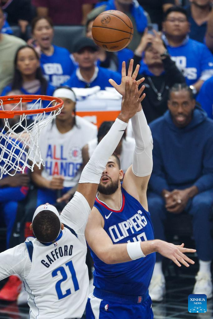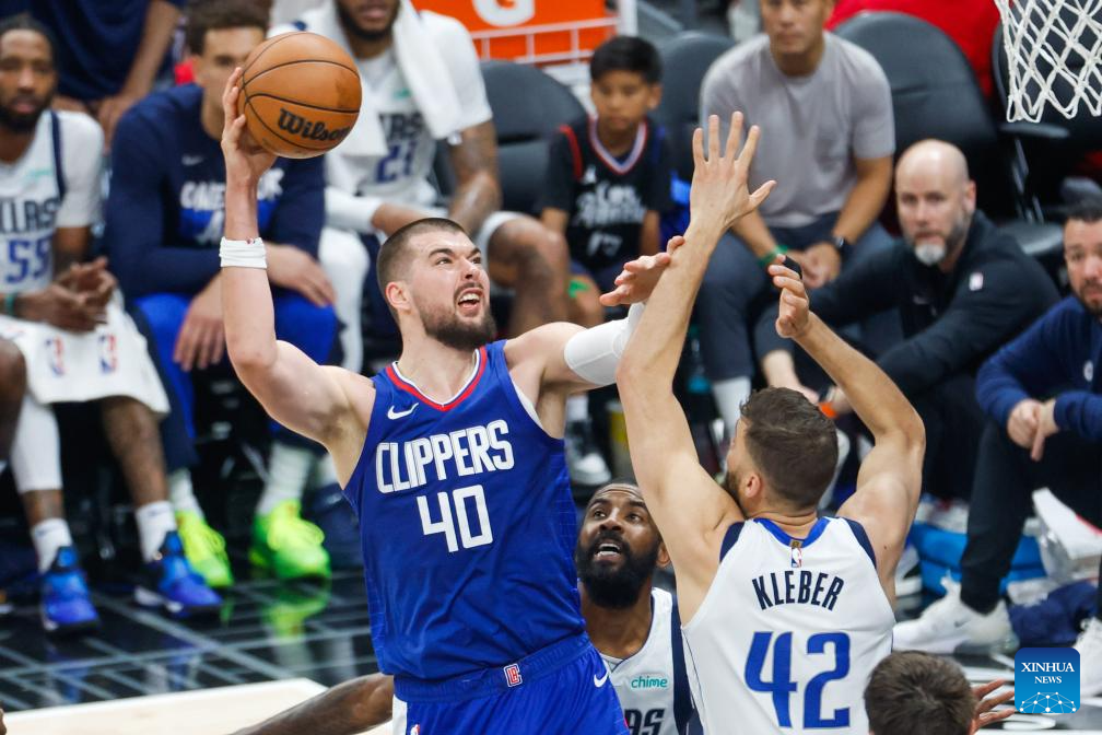 Los Angeles Clippers' Ivica Zubac (L) shoots against Dallas Mavericks' Maxi Kleber (R) during the NBA first-round playoff match between Los Angeles Clippers and Dallas Mavericks in Los Angeles, the United States, April 21, 2024. (Photo by Ringo Chiu/Xinhua)
