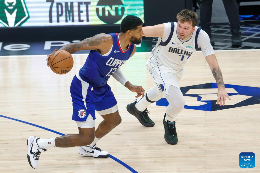 Los Angeles Clippers' Paul George (L) is defended by Dallas Mavericks' Luka Doncic during the NBA first-round playoff match between Los Angeles Clippers and Dallas Mavericks in Los Angeles, the United States, April 21, 2024. (Photo by Ringo Chiu/Xinhua)