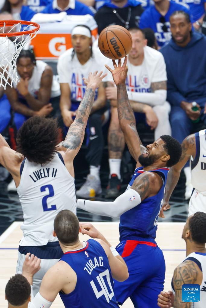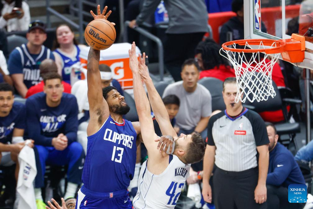 Los Angeles Clippers' Paul George (L) goes up for a basket against Dallas Mavericks' Maxi Kleber during the NBA first-round playoff match between Los Angeles Clippers and Dallas Mavericks in Los Angeles, the United States, April 21, 2024. (Photo by Ringo Chiu/Xinhua)