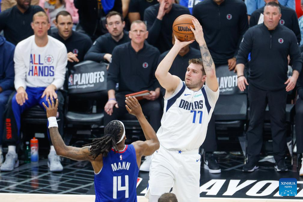 Dallas Mavericks' Luka Doncic (R) shoots against Los Angeles Clippers' Terance Mann during the NBA first-round playoff match between Los Angeles Clippers and Dallas Mavericks in Los Angeles, the United States, April 21, 2024. (Photo by Ringo Chiu/Xinhua)