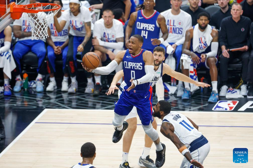 Los Angeles Clippers' Russell Westbrook (C) goes for a layup during the NBA first-round playoff match between Los Angeles Clippers and Dallas Mavericks in Los Angeles, the United States, April 21, 2024. (Photo by Ringo Chiu/Xinhua)