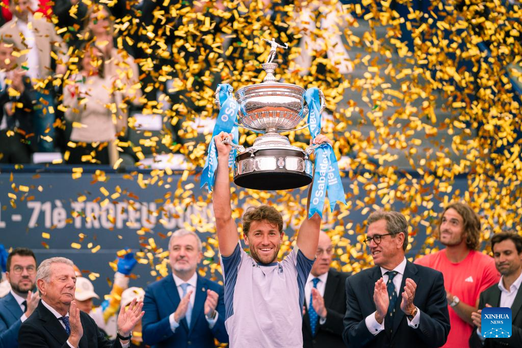 Casper Ruud (C) of Norway celebrates with tropy after winning the final match against Stefanos Tsitsipas of Greece at the ATP Barcelona Open Banc Sabadell tennis tournament in Real Club de Tennis, Barcelona, Spain, April 21, 2024. (Photo by Joan Gosa/Xinhua)