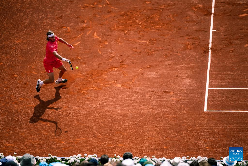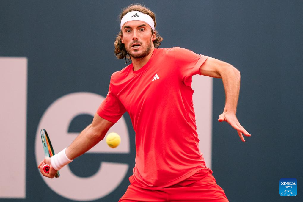 Stefanos Tsitsipas of Greece hits a return during the final match against Casper Ruud of Norway at the ATP Barcelona Open Banc Sabadell tennis tournament in Real Club de Tennis, Barcelona, Spain, April 21, 2024. (Photo by Joan Gosa/Xinhua)