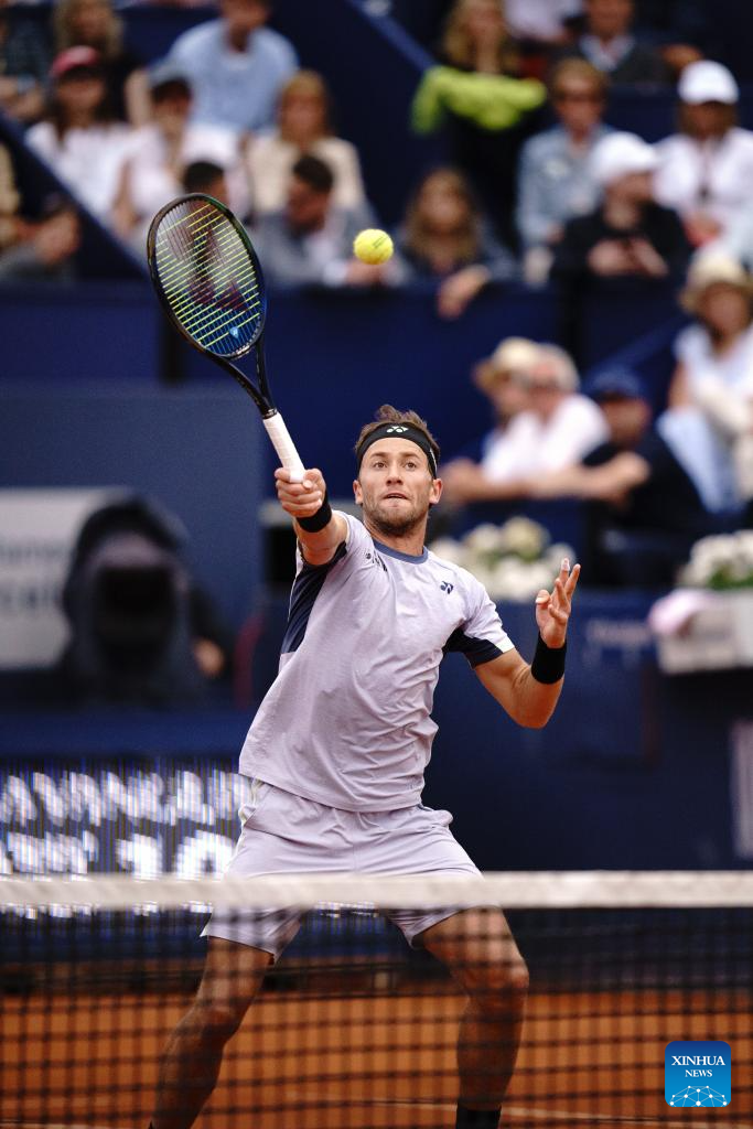 Casper Ruud of Norway hits a return during the final match against Stefanos Tsitsipas of Greece at the ATP Barcelona Open Banc Sabadell tennis tournament in Real Club de Tennis, Barcelona, Spain, April 21, 2024. (Photo by Joan Gosa/Xinhua)