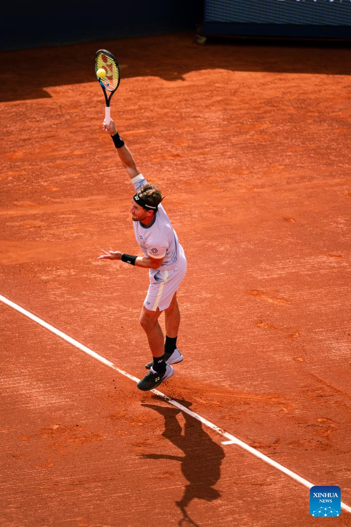 Casper Ruud of Norway serves during the final match against Stefanos Tsitsipas of Greece at the ATP Barcelona Open Banc Sabadell tennis tournament in Real Club de Tennis, Barcelona, Spain, April 21, 2024. (Photo by Joan Gosa/Xinhua)