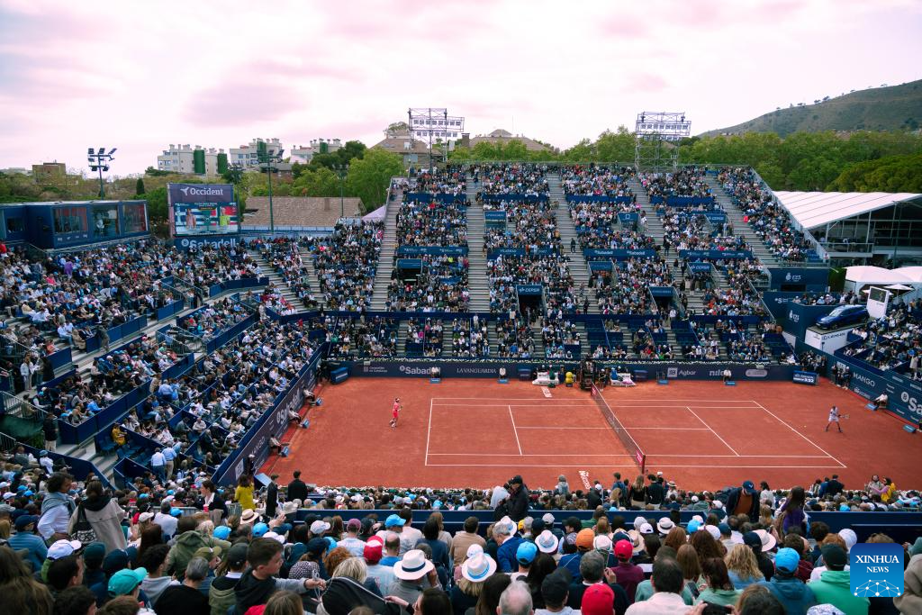 Casper Ruud (R) of Norway hits a return against Stefanos Tsitsipas of Greece during the final match at the ATP Barcelona Open Banc Sabadell tennis tournament in Real Club de Tennis, Barcelona, Spain, April 21, 2024. (Photo by Joan Gosa/Xinhua)