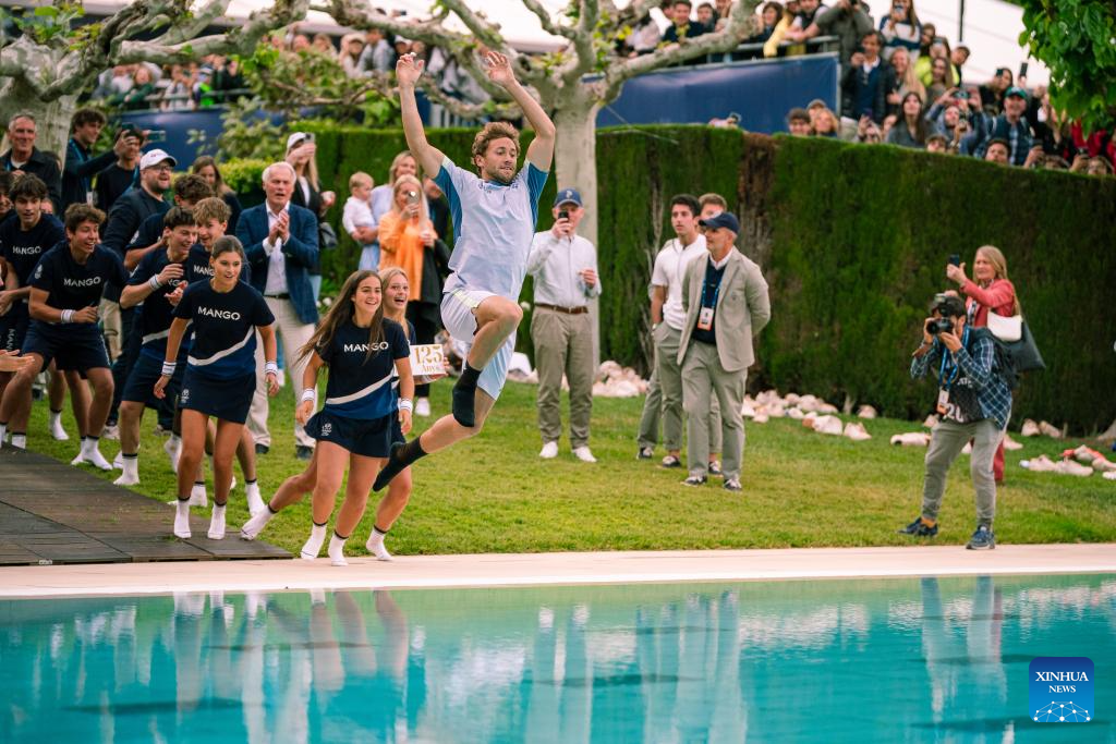 Casper Ruud (C) of Norway jumps into a swimming pool after winning the final match against Stefanos Tsitsipas of Greece at the ATP Barcelona Open Banc Sabadell tennis tournament in Real Club de Tennis, Barcelona, Spain, April 21, 2024. (Photo by Joan Gosa/Xinhua)