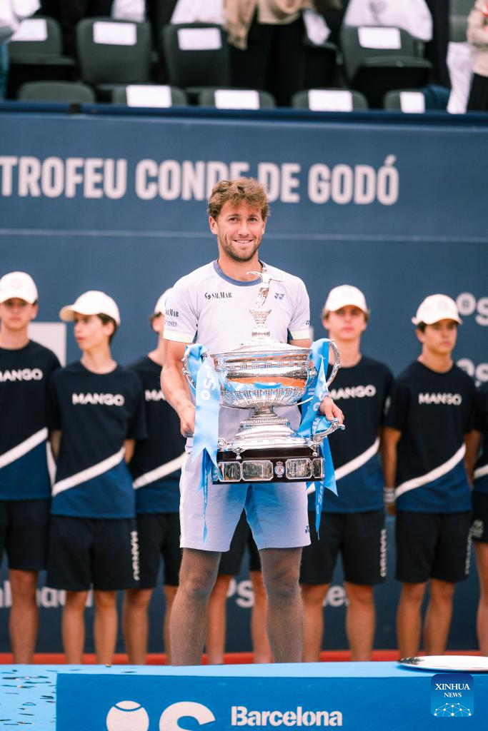 Casper Ruud of Norway poses with tropy after winning the final match against Stefanos Tsitsipas of Greece at the ATP Barcelona Open Banc Sabadell tennis tournament in Real Club de Tennis, Barcelona, Spain, April 21, 2024. (Photo by Joan Gosa/Xinhua)
