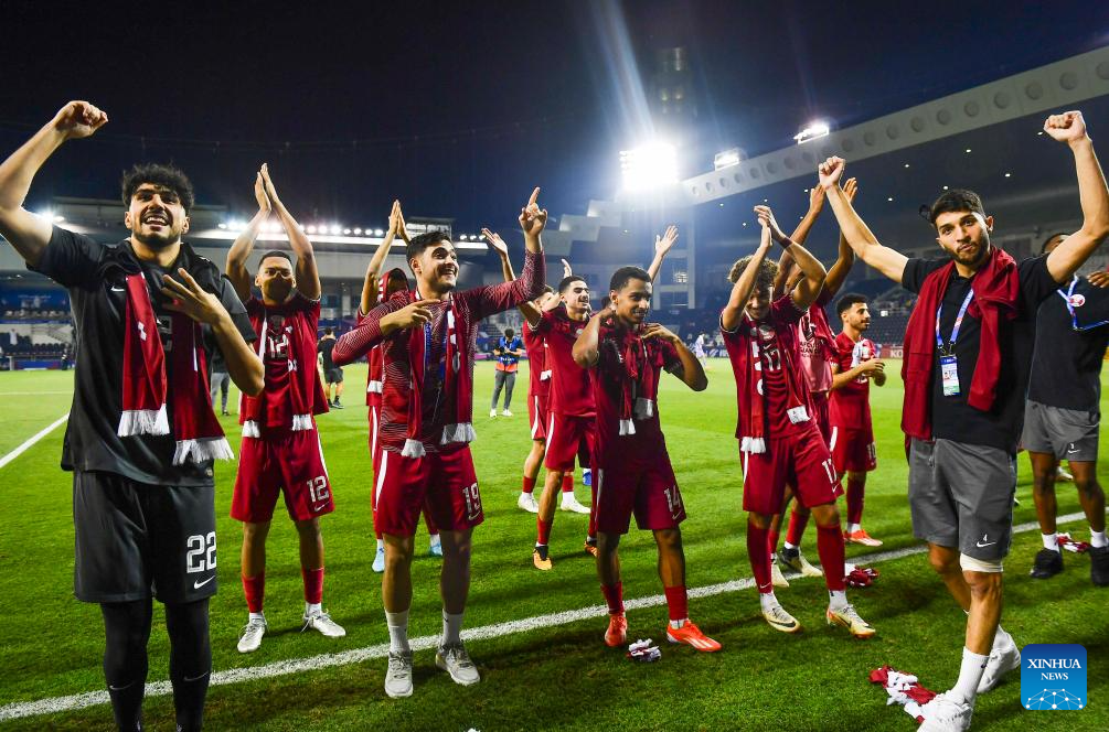 Members of team Qatar celebrate after the Group A match between Qatar and Australia at AFC U23 Asian Cup Qatar 2024 football tournament in Doha, Qatar, April 21, 2024. (Photo by Nikku/Xinhua)