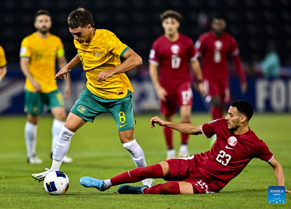 Tameem Mansour Alabdulla (L) of Qatar vies with Jacob Italiano (R) of Australia during the Group A match between Qatar and Australia at AFC U23 Asian Cup Qatar 2024 football tournament in Doha, Qatar, April 21, 2024. (Photo by Nikku/Xinhua)