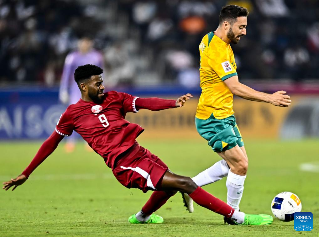Abdallah Sirelkhatimh (R) of Qatar vies with Nicolas Milanovic (L) of Australia during the Group A match between Qatar and Australia at AFC U23 Asian Cup Qatar 2024 football tournament in Doha, Qatar, April 21, 2024. (Photo by Nikku/Xinhua)