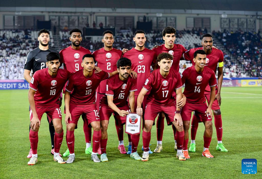 Starting players of Qatar line up prior to the Group A match between Qatar and Australia at AFC U23 Asian Cup Qatar 2024 football tournament in Doha, Qatar, April 21, 2024. (Photo by Nikku/Xinhua)