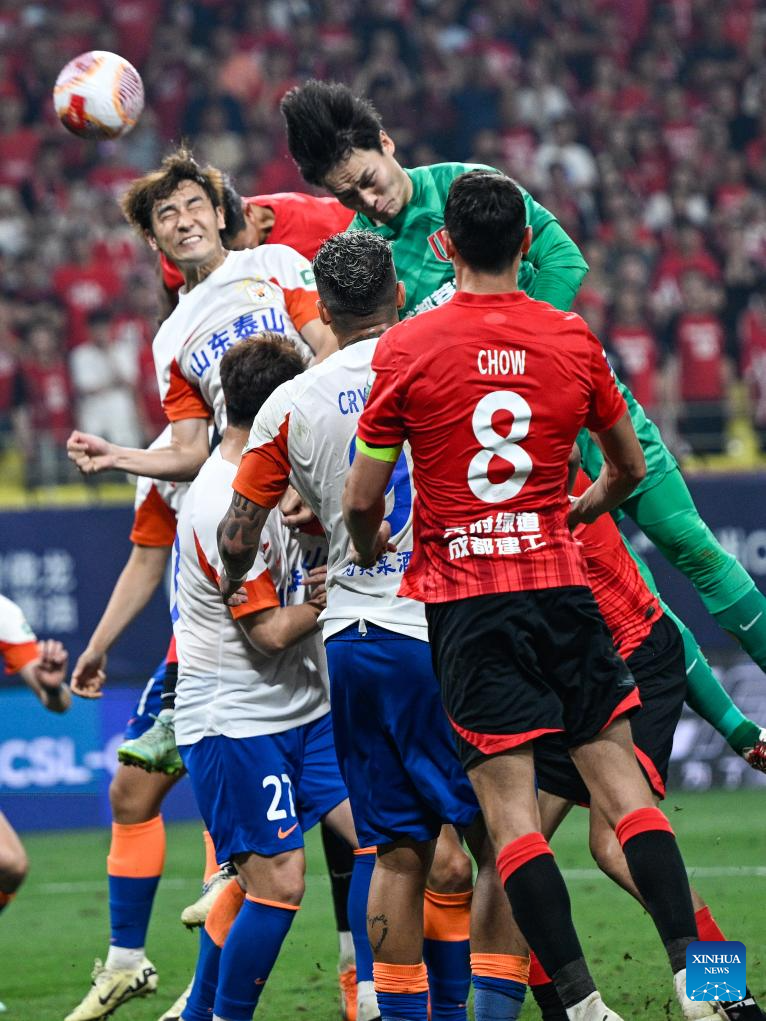 Goalkeeper Zhang Yan (top, R) of Chengdu Rongcheng heads the ball during the 8th round match between Chengdu Rongcheng and Shangdong Taishan at the 2024 Chinese Super League (CSL) in Chengdu, central China's Sichuan Province, April 26, 2024. (Xinhua/Wang Xi)