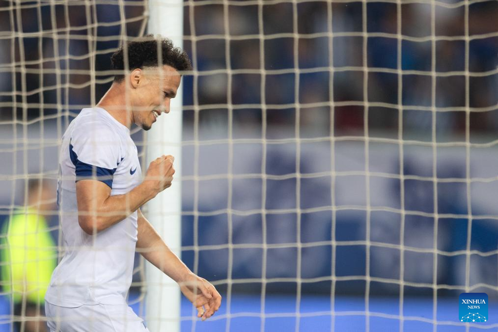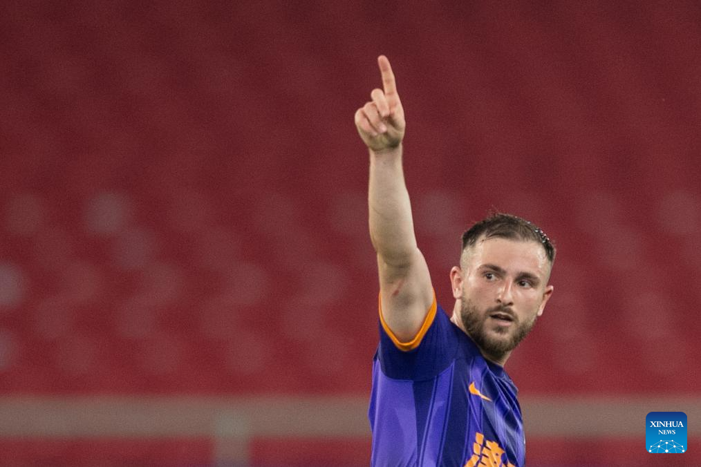 Albion Ademi of Tianjin Jinmen Tiger celebrates his goal during the 8th round match between Tianjin Jinmen Tiger and Wuhan Three Towns FC at the 2024 Chinese Super League (CSL) in Wuhan, central China's Hubei Province, April 26, 2024. (Xinhua/Xiao Yijiu)
