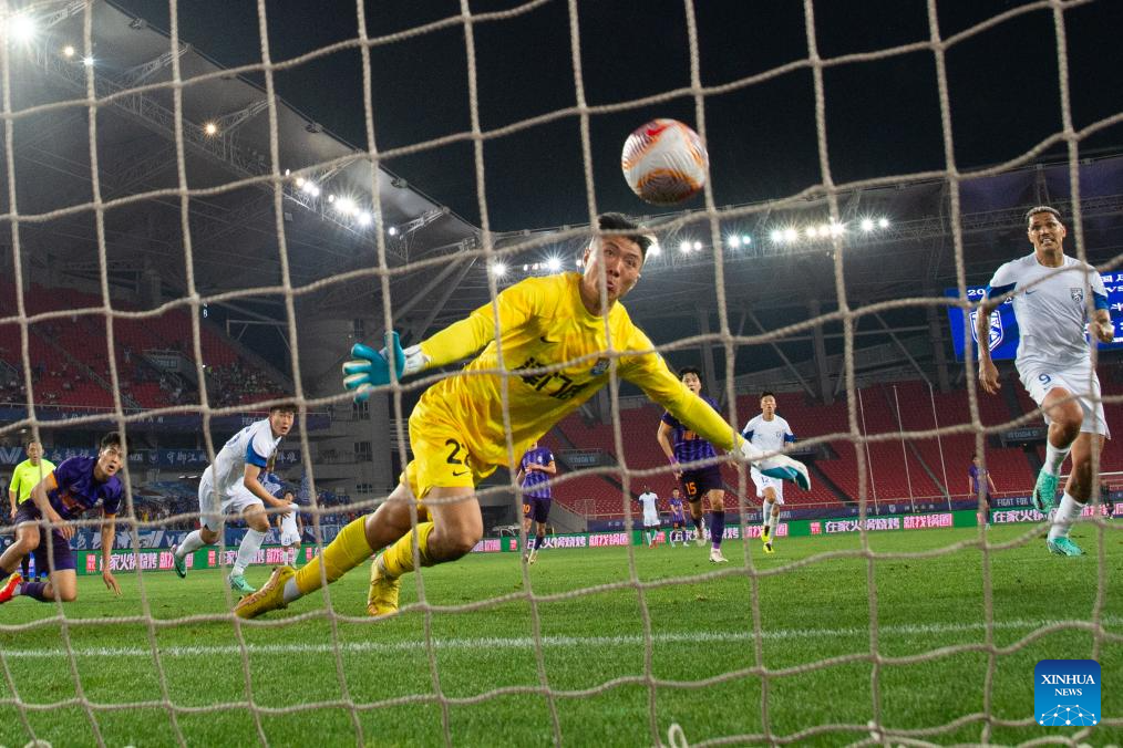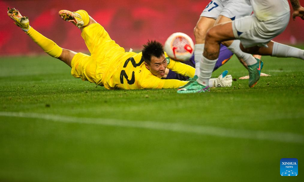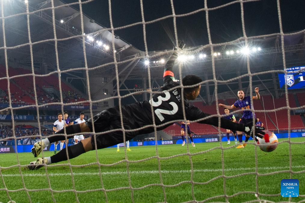 Fang Jingqi (L) of Tianjin Jinmen Tiger tries to save the ball during the 8th round match between Tianjin Jinmen Tiger and Wuhan Three Towns FC at the 2024 Chinese Super League (CSL) in Wuhan, central China's Hubei Province, April 26, 2024. (Xinhua/Xiao Yijiu)