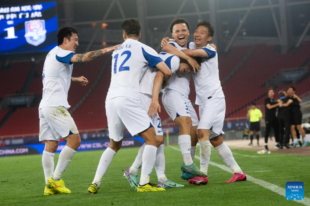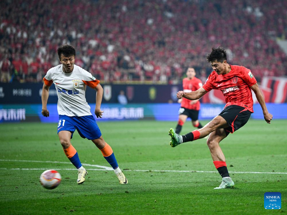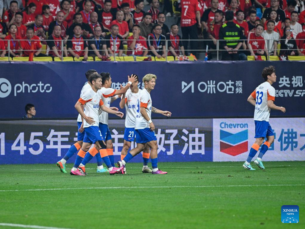Players of Shandong Taishan celebrate a goal during the 8th round match between Chengdu Rongcheng and Shangdong Taishan at the 2024 Chinese Super League (CSL) in Chengdu, central China's Sichuan Province, April 26, 2024. (Xinhua/Wang Xi)