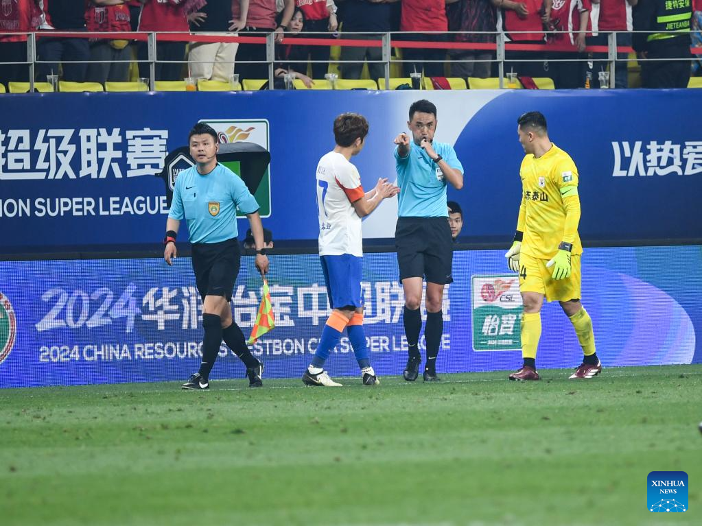 Referee Du Jianxin (2nd R) disallows the goal from Chengdu Rongcheng during the 8th round match between Chengdu Rongcheng and Shangdong Taishan at the 2024 Chinese Super League (CSL) in Chengdu, central China's Sichuan Province, April 26, 2024. (Xinhua/Wang Xi)