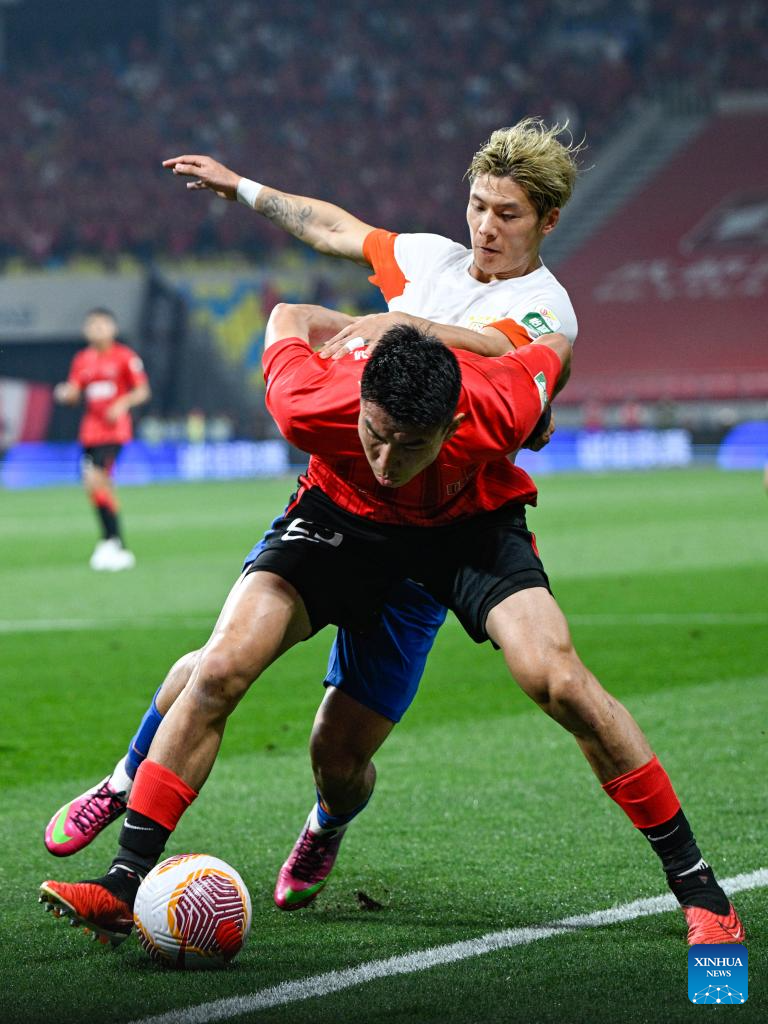 Wu Lei (R) of Chengdu Rongcheng shoots the ball during the 8th round match between Chengdu Rongcheng and Shangdong Taishan at the 2024 Chinese Super League (CSL) in Chengdu, central China's Sichuan Province, April 26, 2024. (Xinhua/Wang Xi)