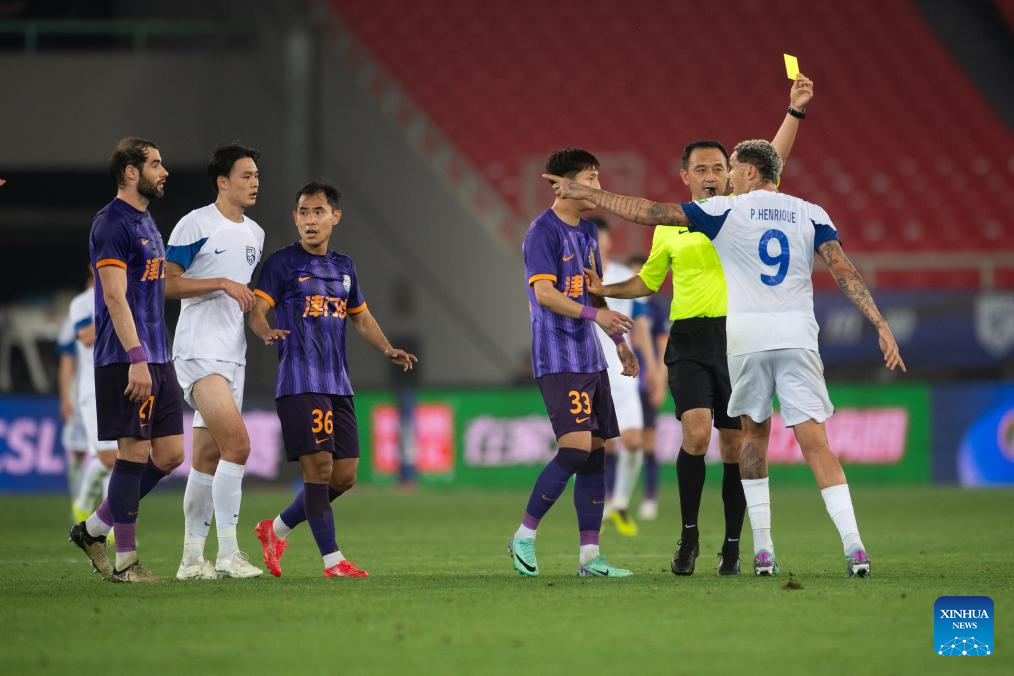 Pedro Henrique (1st R) of Wuhan Three Towns FC gets a yellow card during the 8th round match between Tianjin Jinmen Tiger and Wuhan Three Towns FC at the 2024 Chinese Super League (CSL) in Wuhan, central China's Hubei Province, April 26, 2024. (Xinhua/Xiao Yijiu)