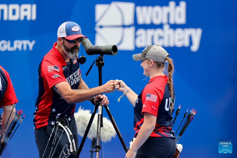 Olivia Dean (R) of team the United States reacts with her coach during the compound mixed team competition at Shanghai 2024 Archery World Cup Stage 1 in Shanghai, China, April 27, 2024. (Xinhua/Wang Xiang)