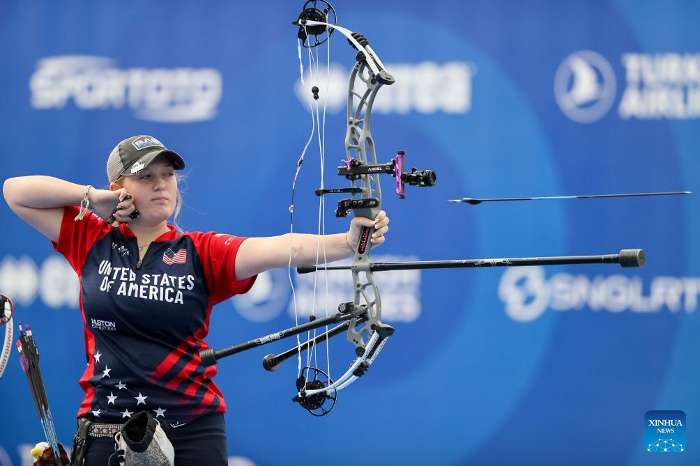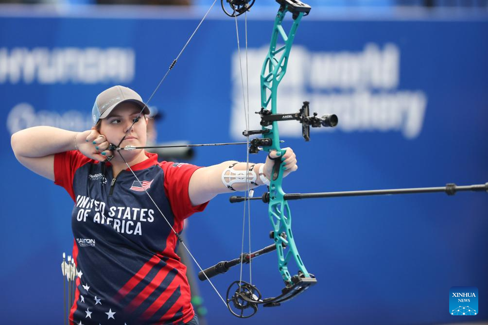 Olivia Dean of team the United States competes during the compound mixed team competition at Shanghai 2024 Archery World Cup Stage 1 in Shanghai, China, April 27, 2024. (Xinhua/Wang Xiang)