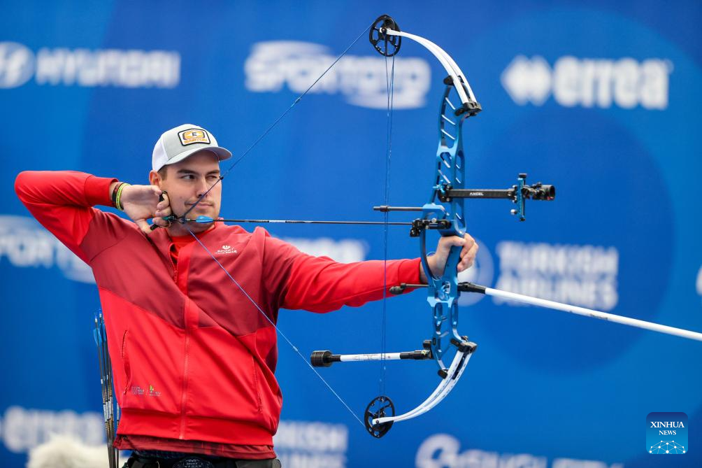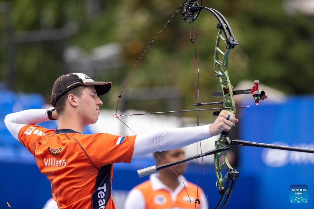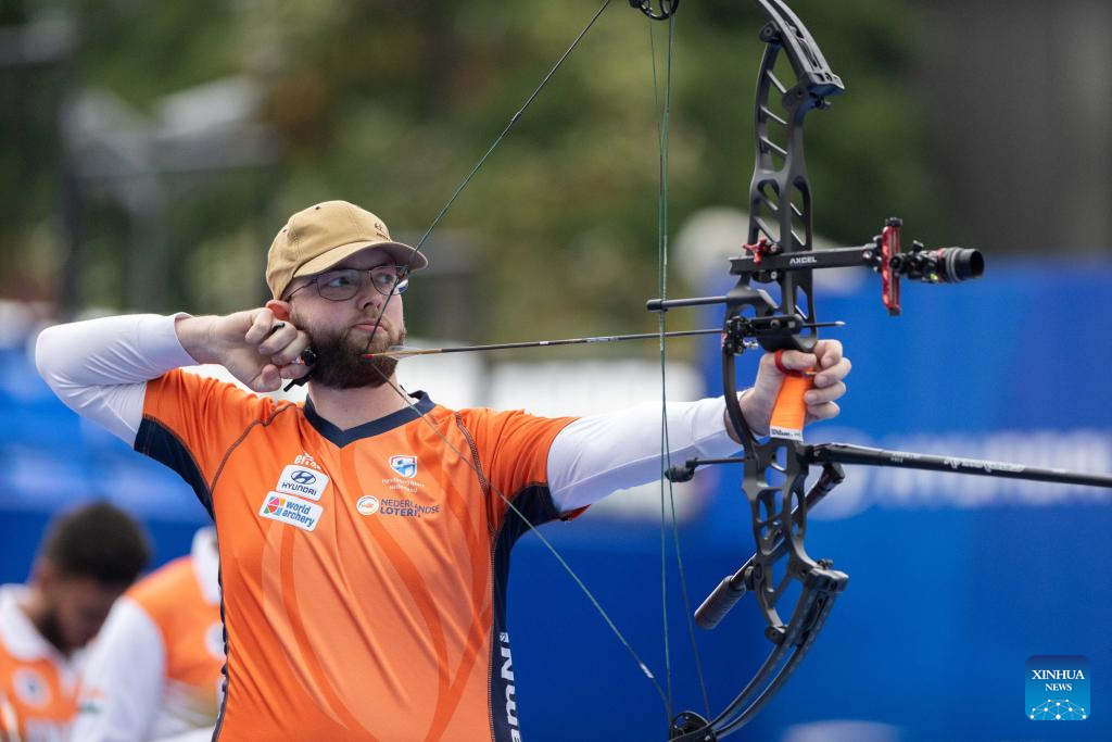 Sil Pater of the Netherlands competes during the men's compound team competition at Shanghai 2024 Archery World Cup Stage 1 in Shanghai, China, April 27, 2024. (Xinhua/Wang Xiang)