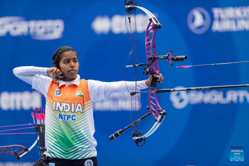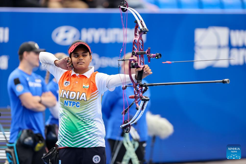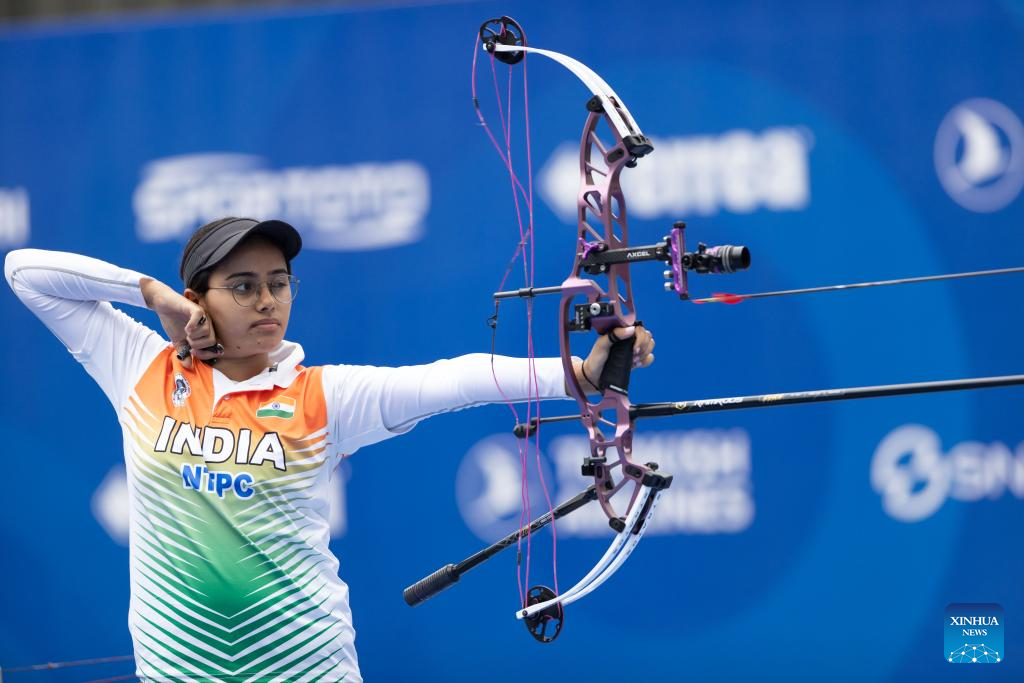 Aditi Gopichand Swami of India competes during the women's compound team competition at Shanghai 2024 Archery World Cup Stage 1 in Shanghai, China, April 27, 2024. (Xinhua/Wang Xiang)