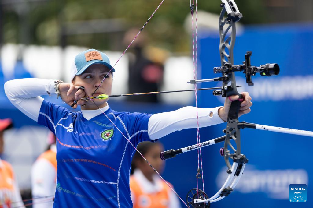 Andrea Becerra of Mexico competes during the women's compound competition at Shanghai 2024 Archery World Cup Stage 1 in Shanghai, China, April 27, 2024. (Xinhua/Wang Xiang)