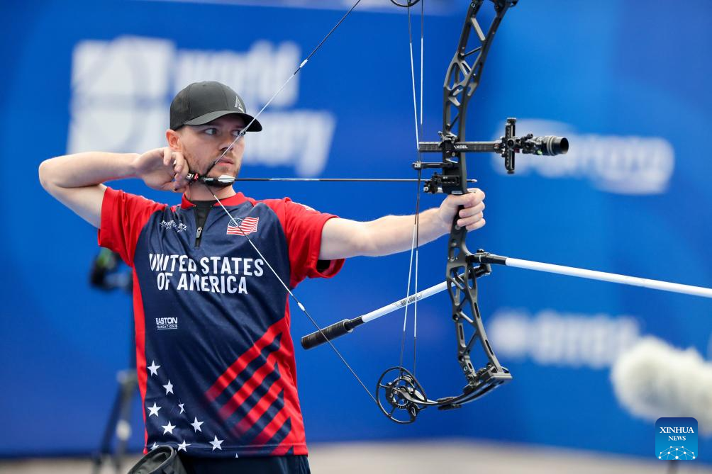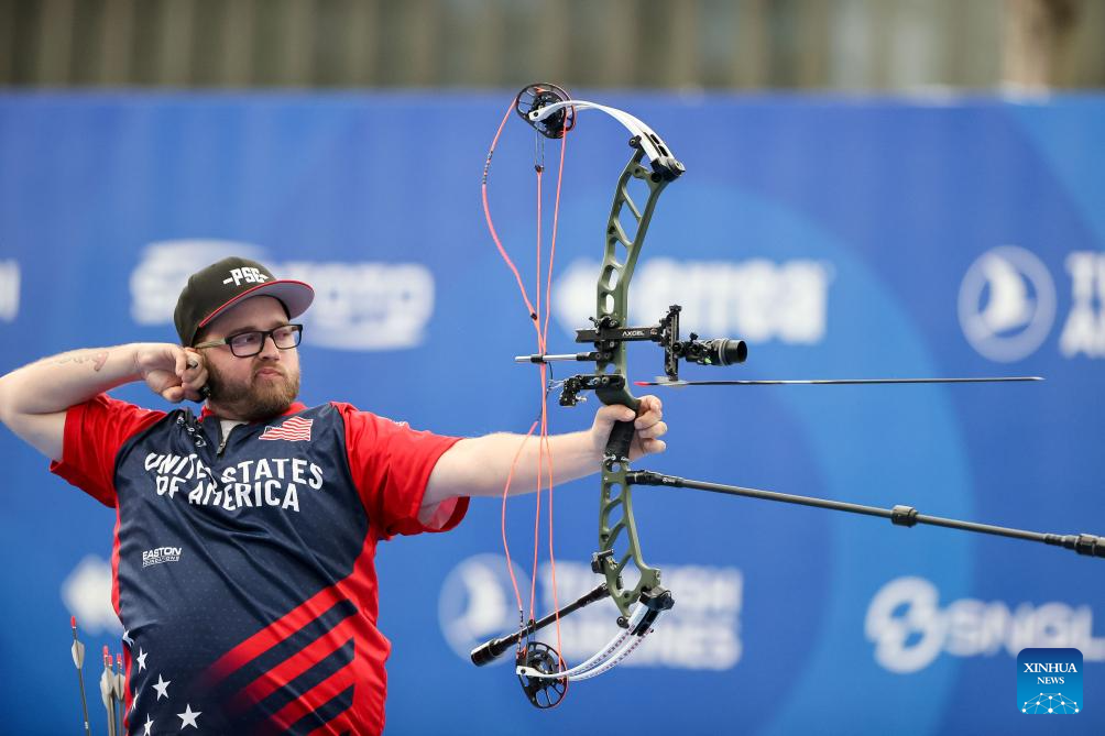 Nick Kappers of the United States competes during the men's compound competition at Shanghai 2024 Archery World Cup Stage 1 in Shanghai, China, April 27, 2024. (Xinhua/Wang Xiang)