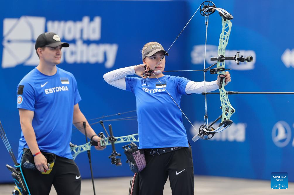 Lisell Jaatma (R) of team Estonia competes during the compound mixed team competition at Shanghai 2024 Archery World Cup Stage 1 in Shanghai, China, April 27, 2024. (Xinhua/Wang Xiang)