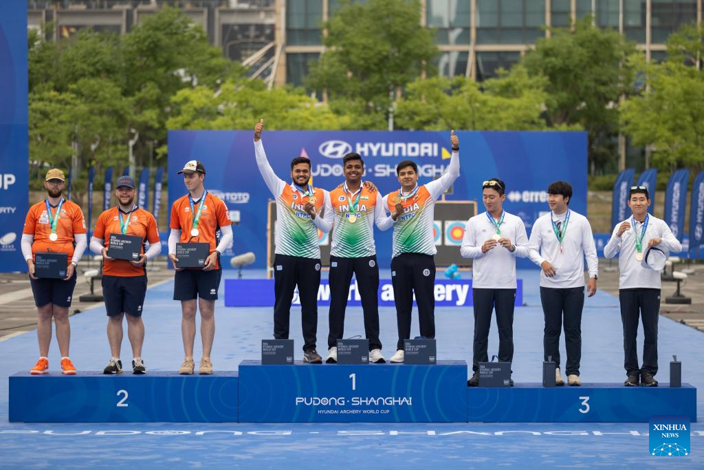 Gold medalists team India (C), silver medalists team the Netherlands (L), bronze medalists team South Korea pose on the podium after the men's compound team competition at Shanghai 2024 Archery World Cup Stage 1 in Shanghai, China, April 27, 2024. (Xinhua/Wang Xiang)