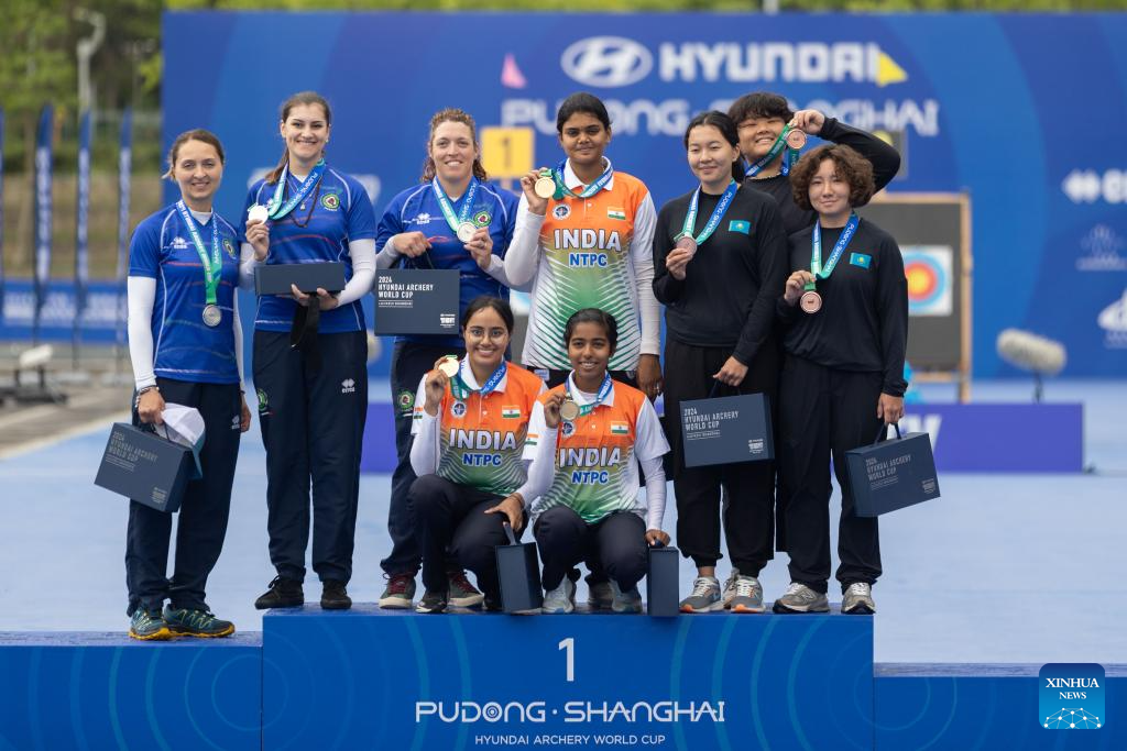 Gold medalists team India (C), silver medalists team Italy (L) and bronze medalists team Kazakhstan pose on the podium after the women's compound team competition at Shanghai 2024 Archery World Cup Stage 1 in Shanghai, China, April 27, 2024. (Xinhua/Wang Xiang)