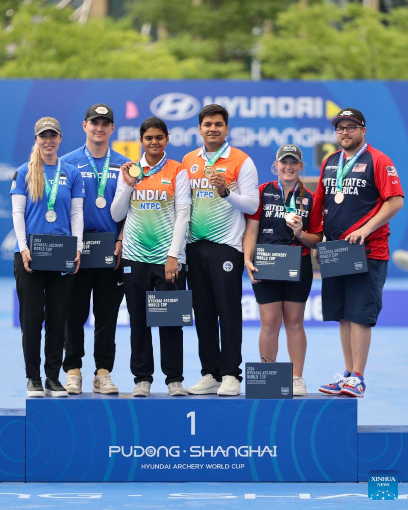 Gold medalists Team India (C), silver medalists team Estonia (L) and bronze medalists team the United States pose on the podium after the compound mixed team competition at Shanghai 2024 Archery World Cup Stage 1 in Shanghai, China, April 27, 2024. (Xinhua/Wang Xiang)