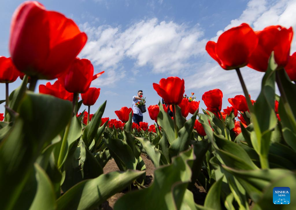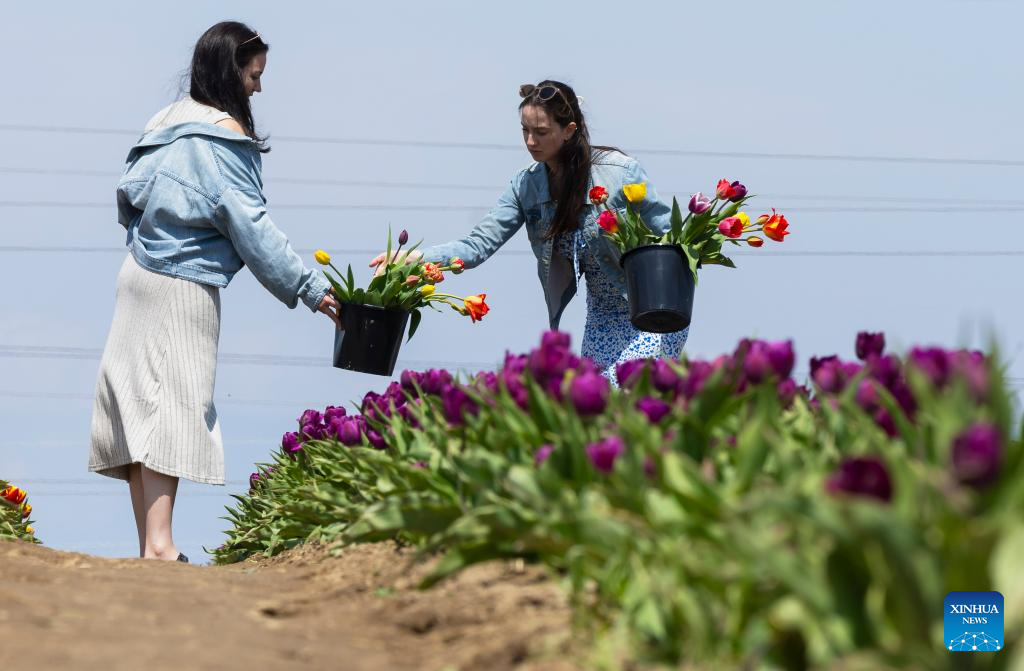 People pick tulips at a tulip pick farm in Ridgeville, Ontario, Canada, on April 29, 2024. (Photo by Zou Zheng/Xinhua)