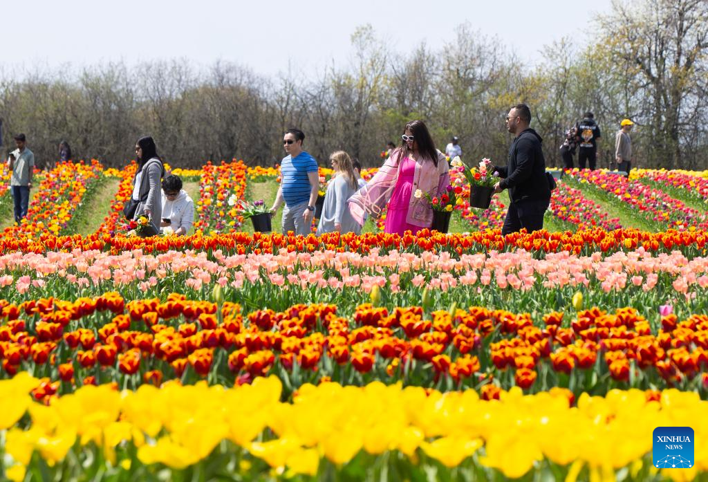 People visit a tulip pick farm in Ridgeville, Ontario, Canada, on April 29, 2024. (Photo by Zou Zheng/Xinhua)