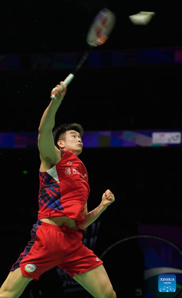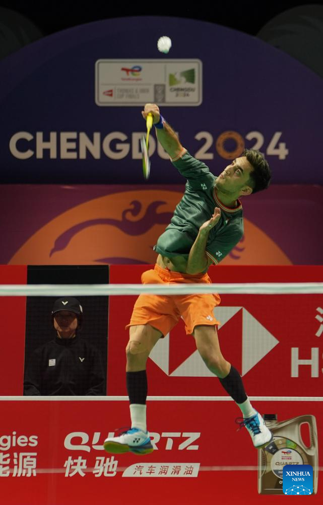 Lakshya Sen of India competes in the singles match against Li Shifeng of China of the quarterfinal between China and India at BWF Thomas Cup Finals in Chengdu, southwest China's Sichuan Province, May 2, 2024. (Xinhua/Jiang Hongjing)