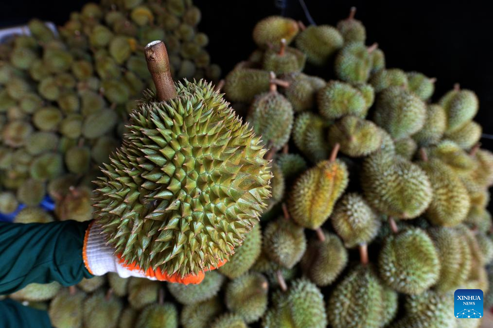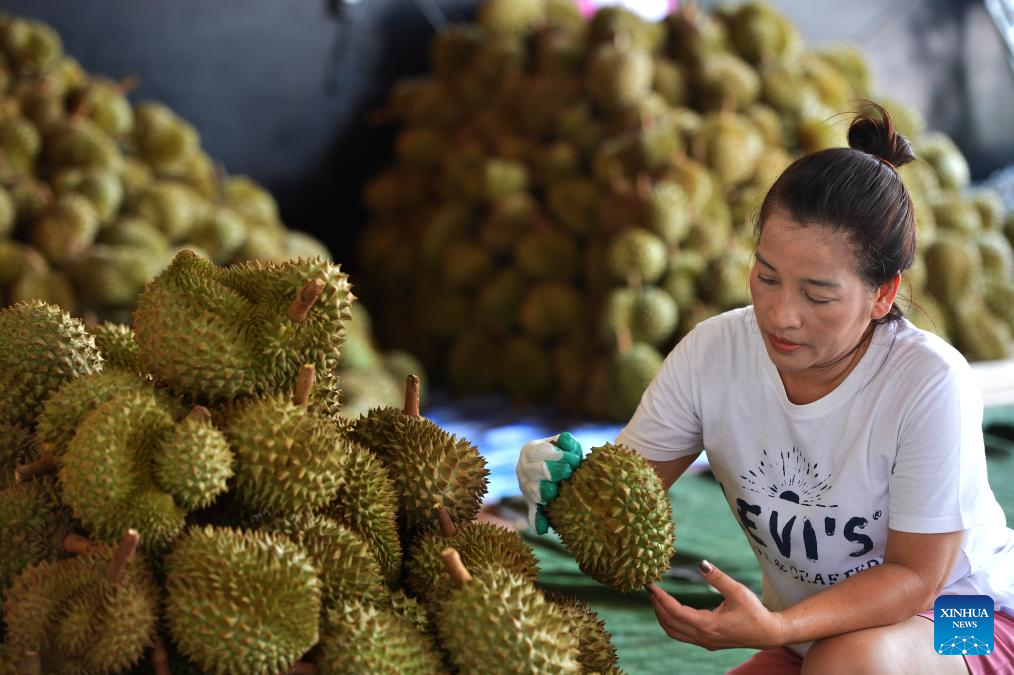 A vendor selects durians for customers in Bangkok, Thailand, April 30, 2024. Each year the time period from April to May is the peak durian harvest season in eastern Thailand. (Xinhua/Rachen Sageamsak)