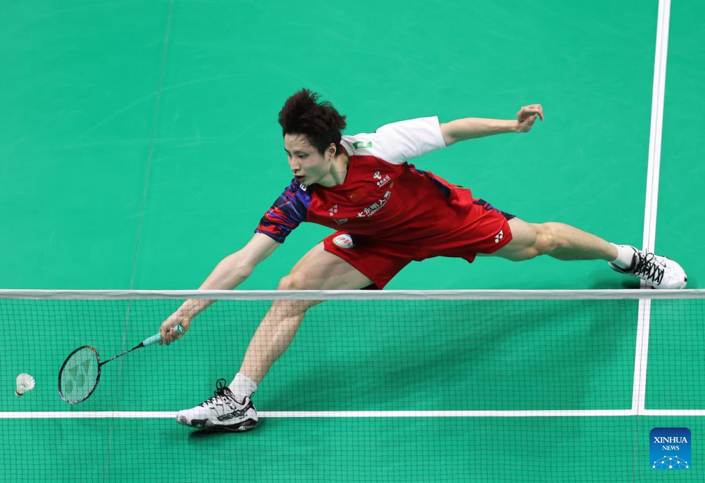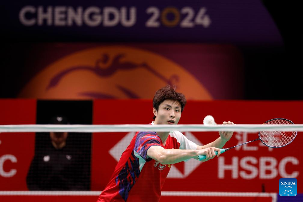 Shi Yuqi of China hits a return during the singles match against Anthony Sinisuka Ginting of Indonesia in the final match at the BWF Thomas Cup Finals in Chengdu, southwest China's Sichuan Province, May 5, 2024. (Xinhua/Jia Haocheng)