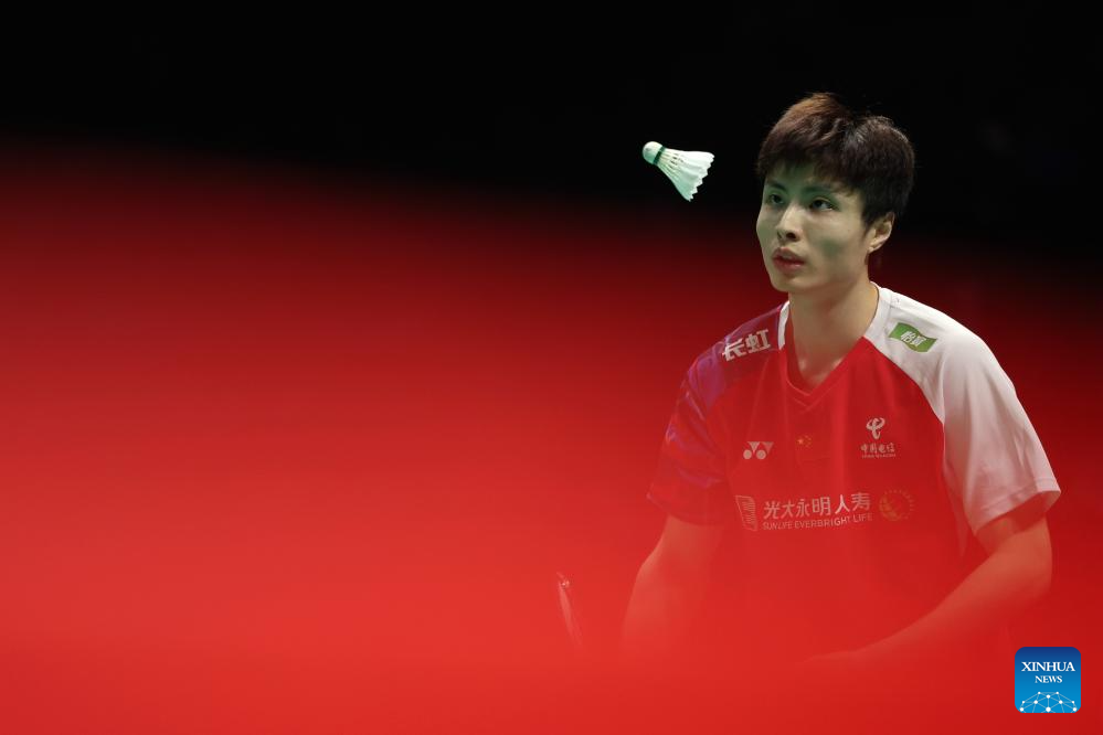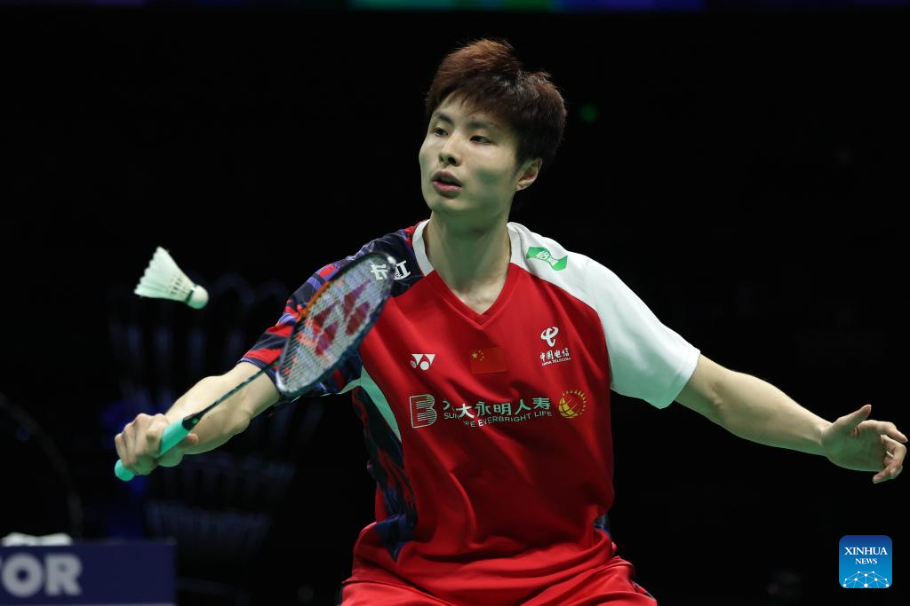 Shi Yuqi of China hits a return during the singles match against Anthony Sinisuka Ginting of Indonesia in the final match at the BWF Thomas Cup Finals in Chengdu, southwest China's Sichuan Province, May 5, 2024. (Xinhua/Hou Zhaokang)