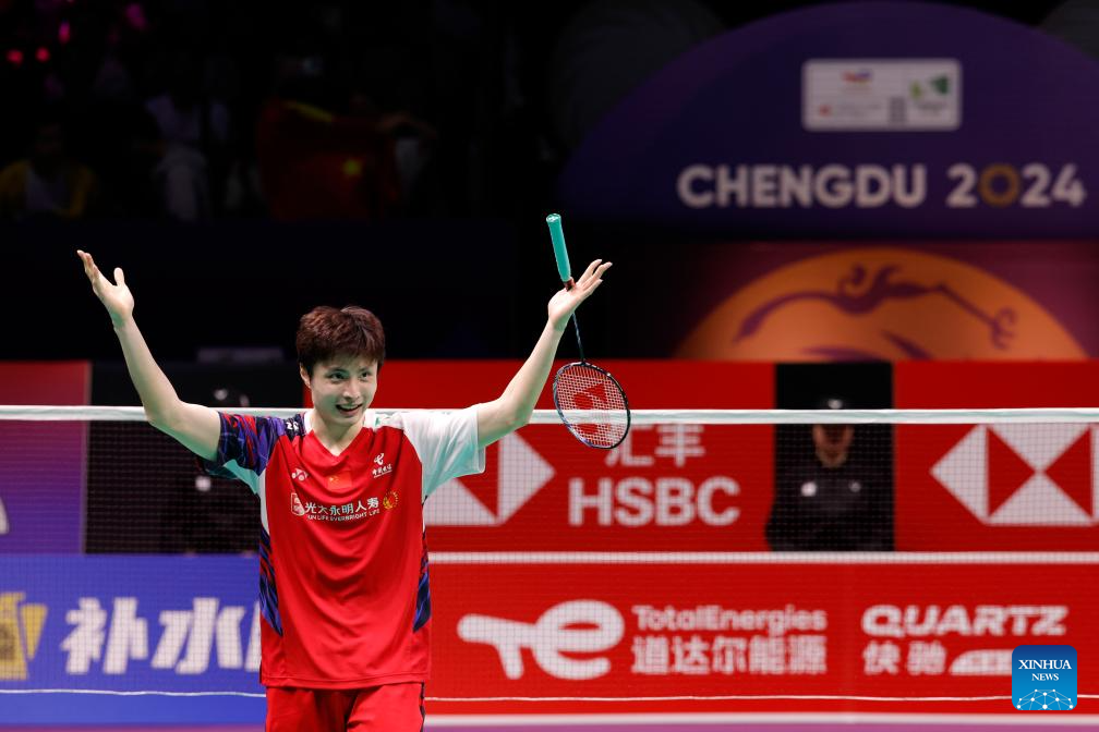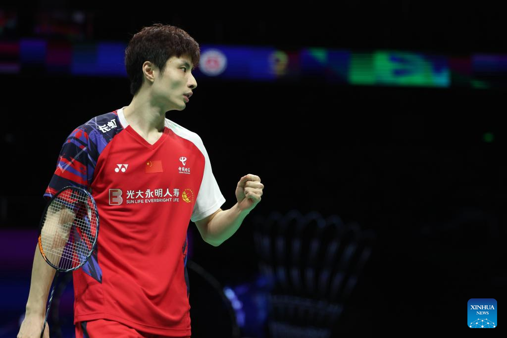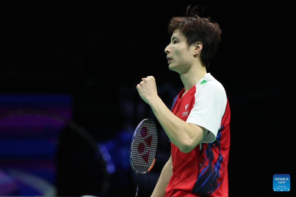 Shi Yuqi of China reacts after winning the singles match against Anthony Sinisuka Ginting of Indonesia in the final match at the BWF Thomas Cup Finals in Chengdu, southwest China's Sichuan Province, May 5, 2024. (Xinhua/Shen Bohan)