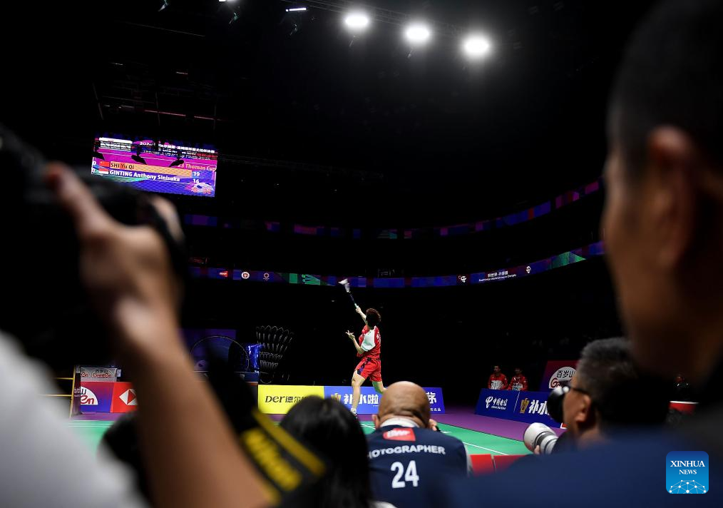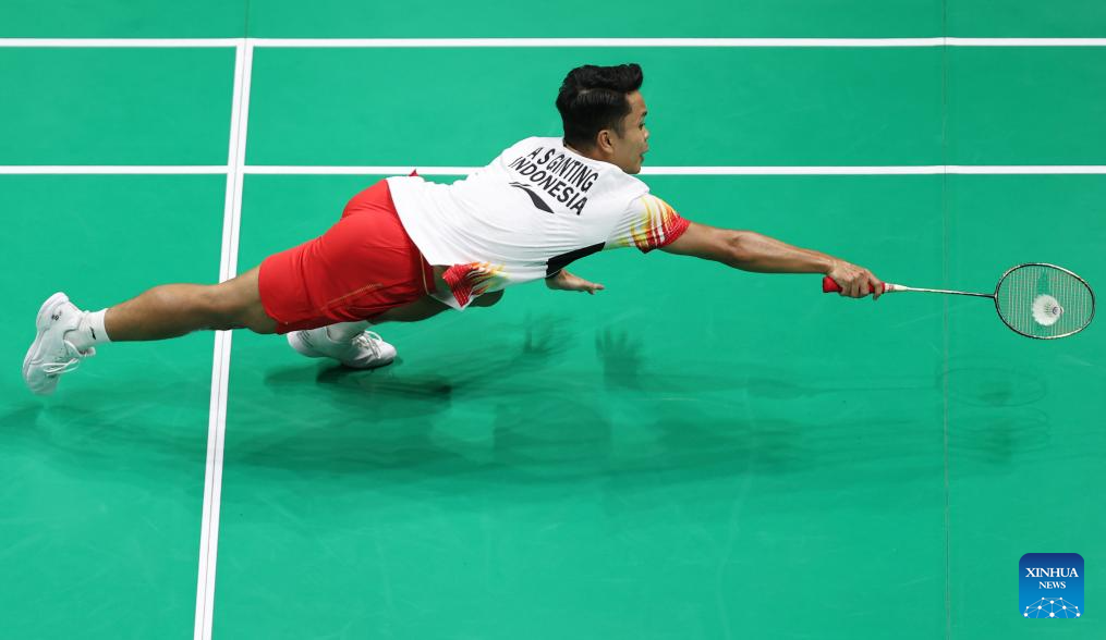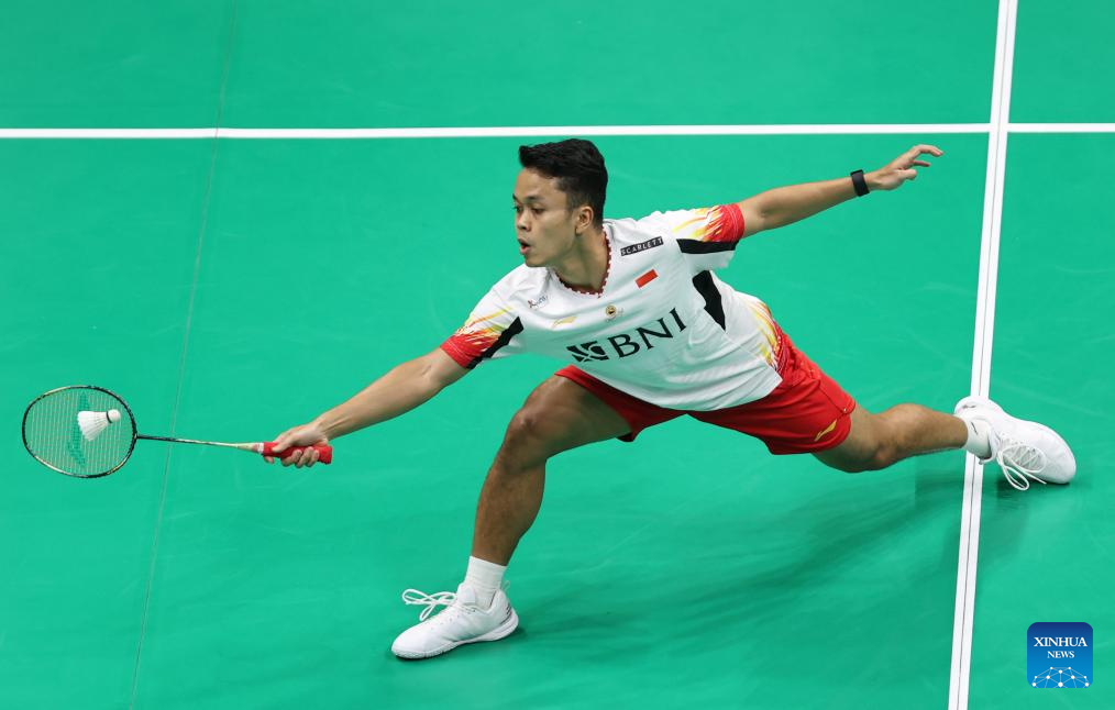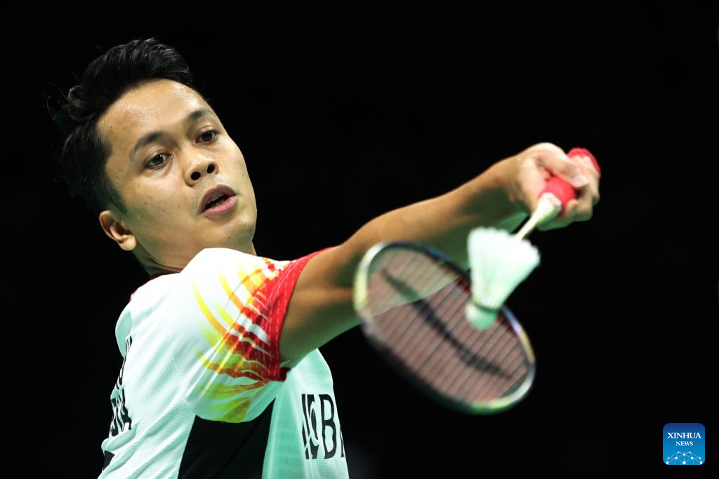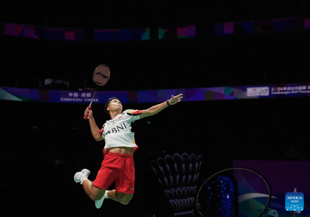 Anthony Sinisuka Ginting of Indonesia hits a return during the singles match against Shi Yuqi of China in the final match at the BWF Thomas Cup Finals in Chengdu, southwest China's Sichuan Province, May 5, 2024. (Xinhua/Chen Bin)