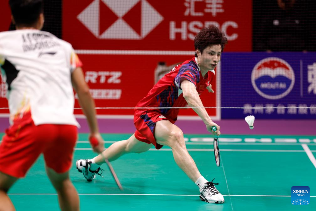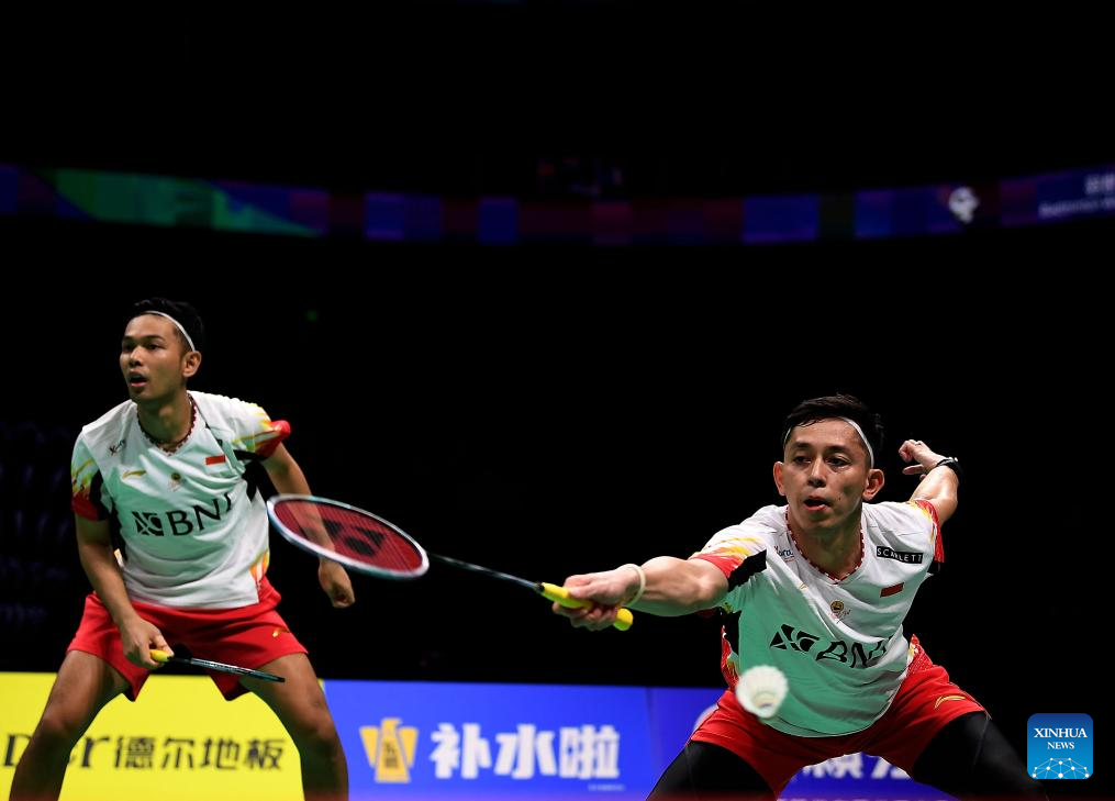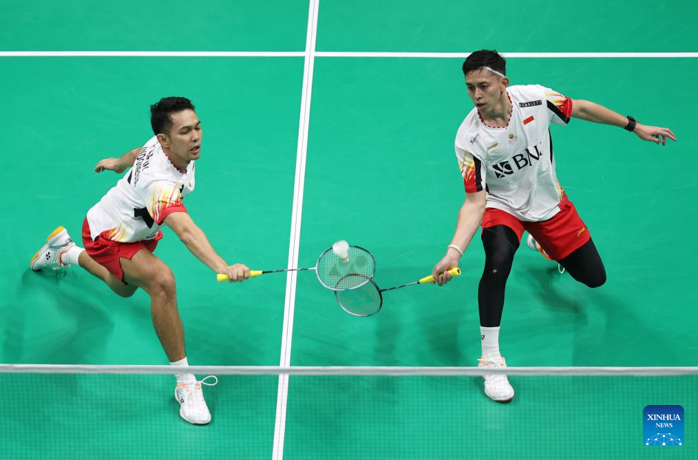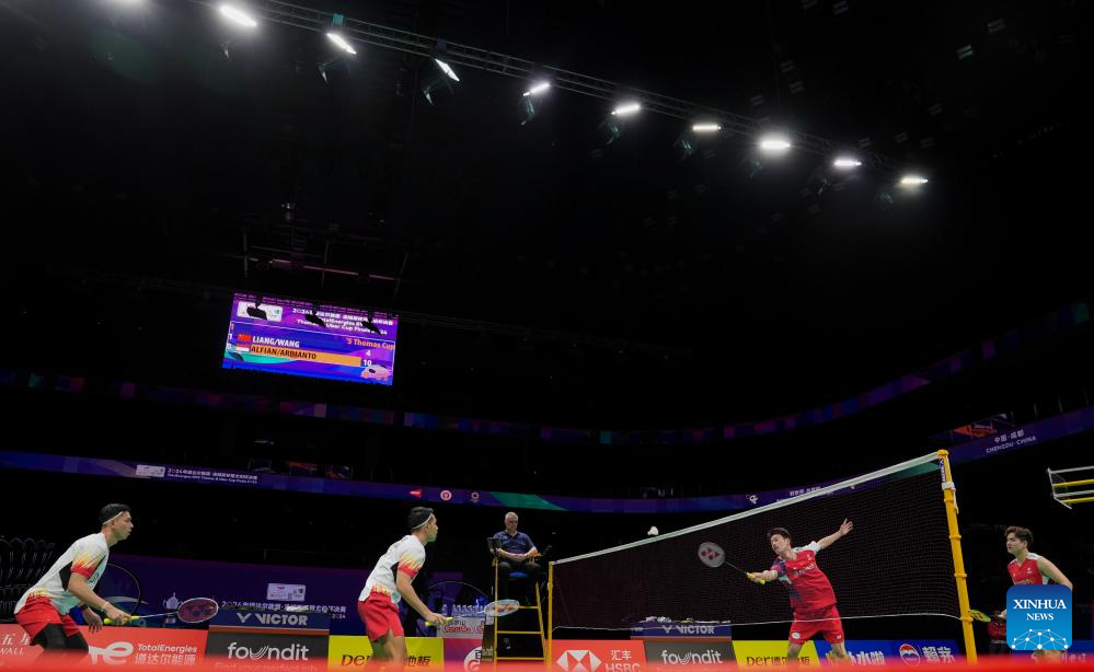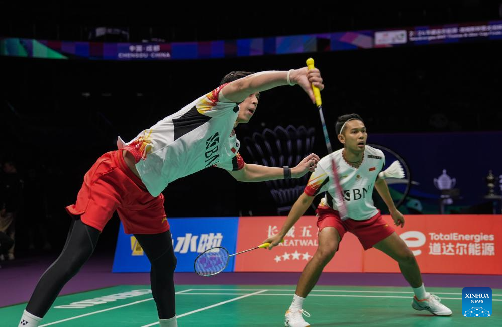 Muhammad Rian Ardianto (R)/Fajar Alfian of Indonesia compete during the doubles match against Liang Weikeng/Wang Chang of China in the final match at the BWF Thomas Cup Finals in Chengdu, southwest China's Sichuan Province, May 5, 2024. (Xinhua/Jia Haocheng)